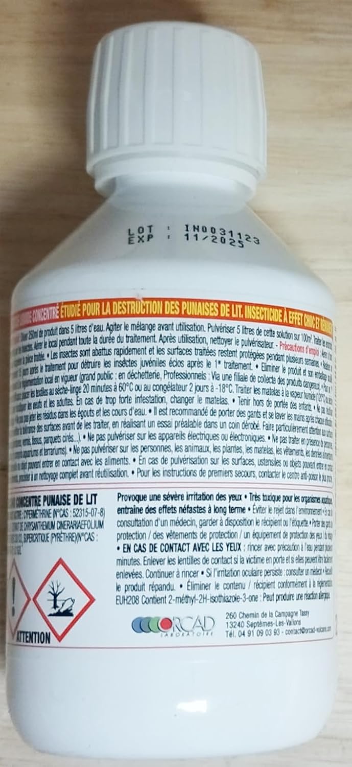 - Mode d’emploi : Agiter le flacon avant utilisation. Pulvériser 5L de cette solution sur 100m². Traiter les endroits fréquentés par les insectes.